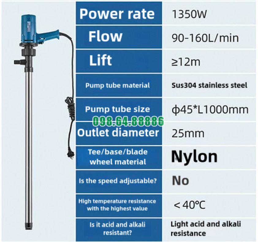 Sử dụng Bơm điện hút thùng phuy JDT-1350W-SUS304N để chiết rót hóa chất nhẹ mang lại hiệu quả cao nhờ tốc độ bơm nhanh, vật liệu chống ăn mòn và khả năng vận hành an toàn. Đây là lựa chọn phù hợp cho các doanh nghiệp cần chiết rót hóa chất nhẹ một cách chuyên nghiệp và hiệu quả.