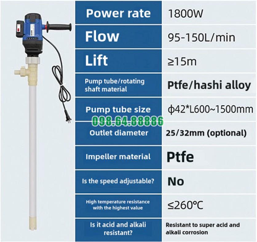 Máy bơm điện chuyển hóa chất thùng phuy JDT-1800W-PTFE