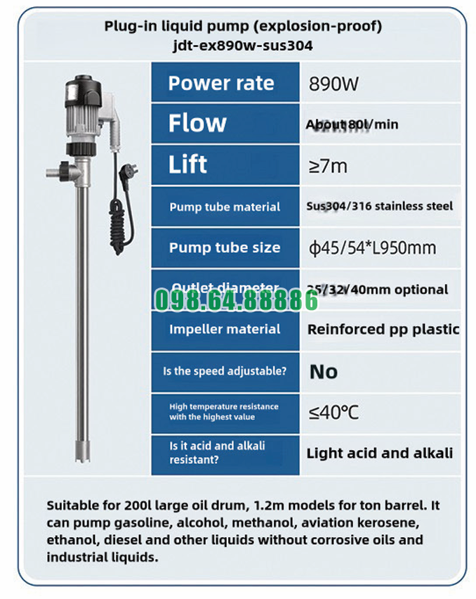 Vận hành Máy bơm chất lỏng cắm trực tiếp chống cháy nổ JDT-EX890W-SUS304 cho thùng tấn IBC