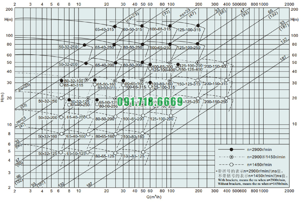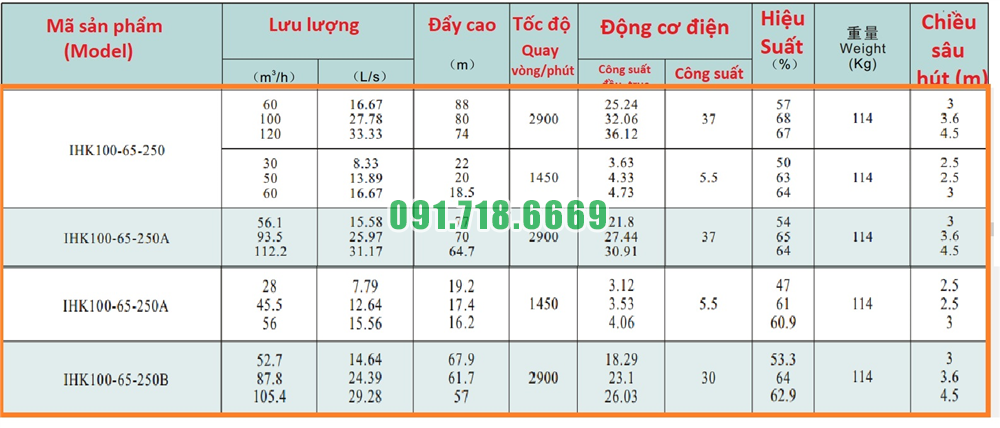 Bảng lưu lượng của máy bơm nước cánh hở IHK100-65-250 đường thoát đầu vào ra Dn100