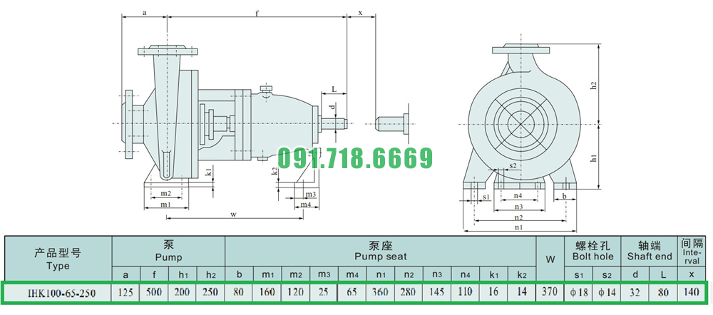 Kích thước của đầu máy bơm nước cánh hở IHK100-65-250 đường thoát đầu vào ra Dn100