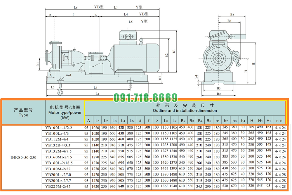 Kích thước lắp đặt của máy bơm nước cánh hở IHK100-65-250 đường thoát đầu vào ra Dn100