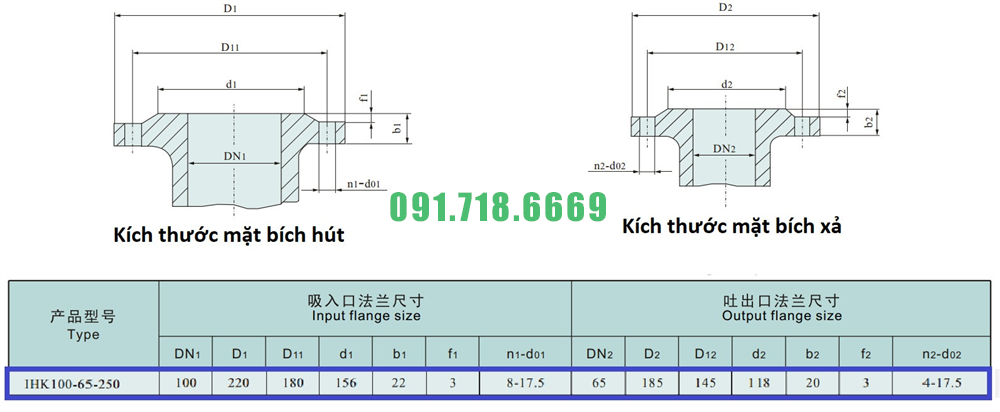 Kích thước mặt bích của máy bơm nước cánh hở IHK100-65-250 đường thoát đầu vào ra Dn100