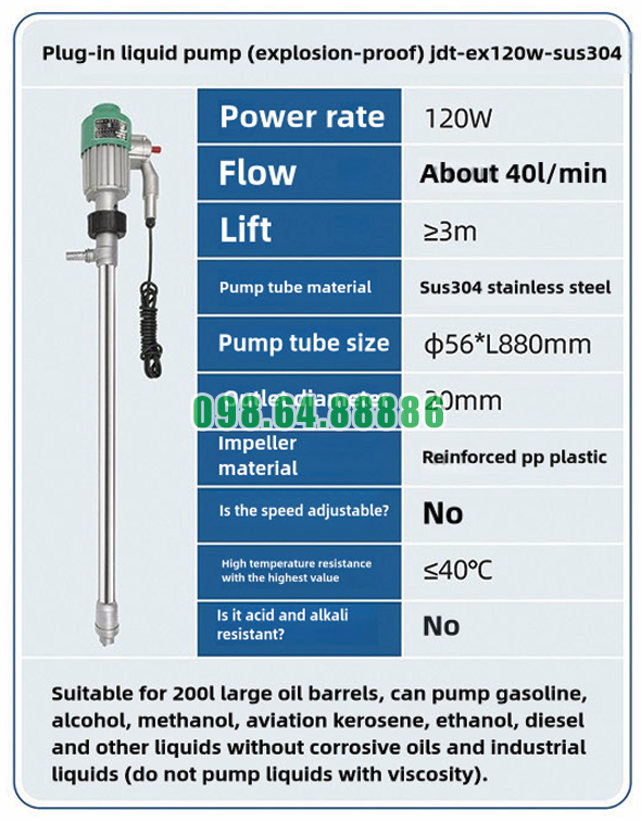 Bơm chất lỏng cắm điện chống cháy nổ JDT-EX120W-SUS304 có kích thước gọn, dễ dàng sử dụng trong không gian hẹp, phù hợp với kho nhỏ.