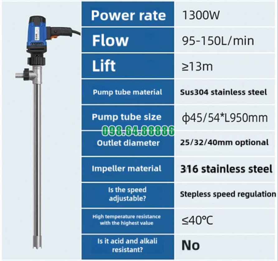 Công suất: 1300W; Lưu lượng: 95–150 lít/phút; Cột áp: ≥13 m; Vật liệu ống bơm: Inox SUS304; Kích thước ống bơm: Φ45 / 54 × dài 950 mm; Đường kính đầu ra: 25 / 32 / 40 mm (tùy chọn); Vật liệu cánh bơm: Inox 316; Điều chỉnh tốc độ vô cấp;Khả năng chịu nhiệt tối đa:≤ 40°C; Không chịu được axit và kiềm