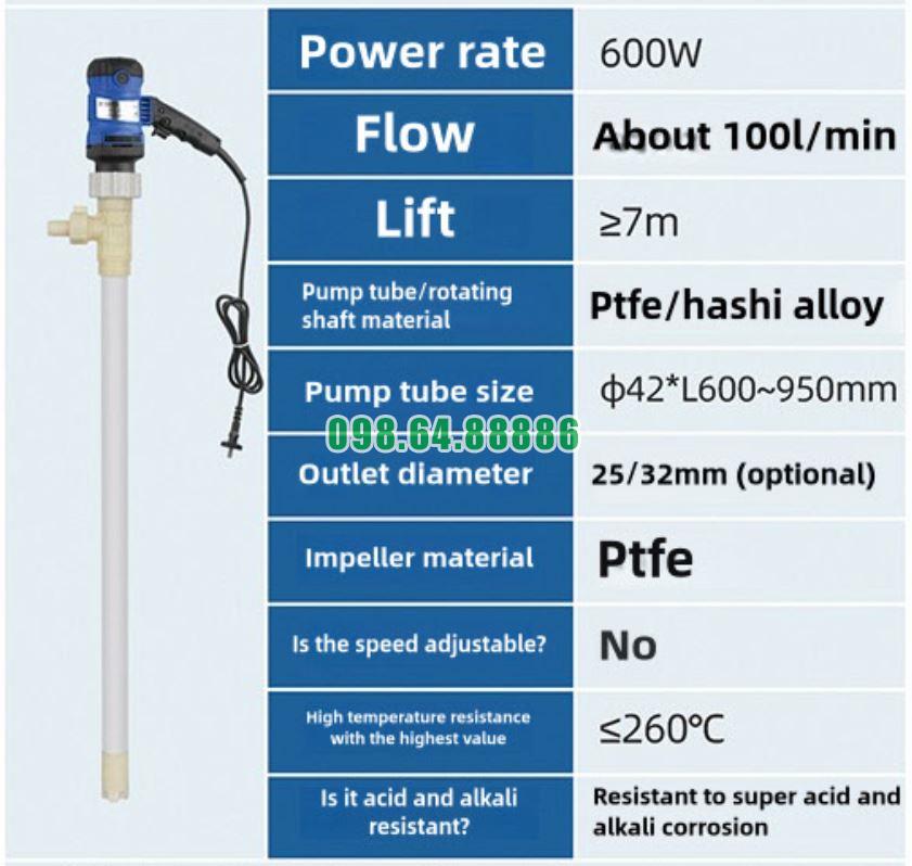 Bơm điện rút hóa chất từ phuy 20–200 lít, chống ăn mòn model JDT-600W
