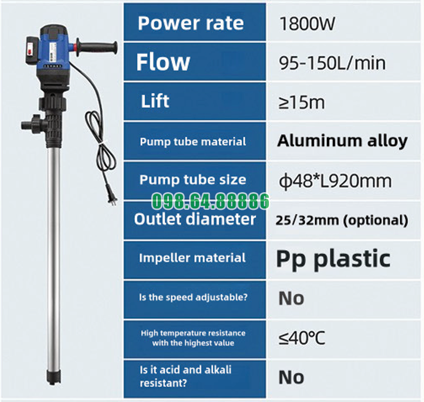 Mật rỉ đường là loại chất lỏng có độ nhớt cao, nặng và khó chiết rót, thường được sử dụng trong sản xuất thức ăn chăn nuôi, lên men sinh học, công nghiệp thực phẩm và năng lượng sinh học. Việc hút và chiết rót mật rỉ đường đòi hỏi thiết bị bơm có lực mạnh, vận hành ổn định và chịu tải tốt. Bơm điện thùng phuy cao cấp JDT-1800W-L92 được đánh giá là giải pháp phù hợp và hiệu quả cho ứng dụng đặc thù này.