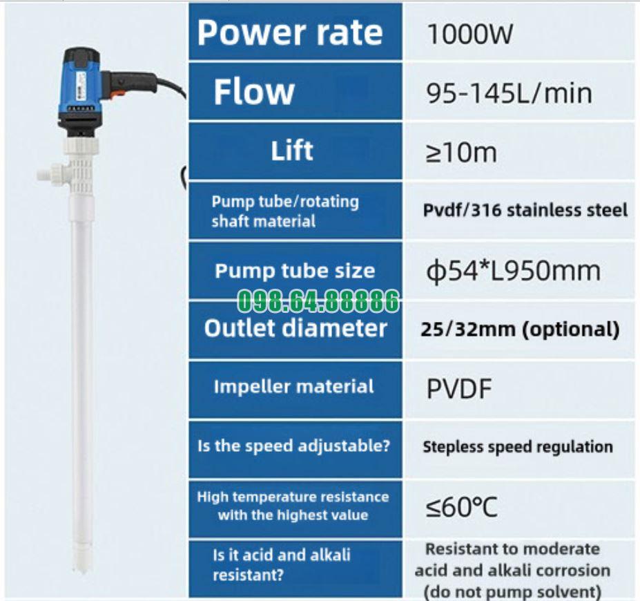 Bơm cắm điện thùng phuy model JDT-1000W-PVDF là lựa chọnhàng đầu nhờ thiết kế chuyên dụng, hiệu suất ổn định, vật liệu bền bỉ và hiệuquả kinh tế lâu dài.