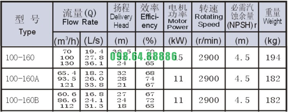 Bảng thông số kỹ thuật bơm li tâm trục ngang mã SLW100-ISW100-160 lưu lượng 130 m3/h