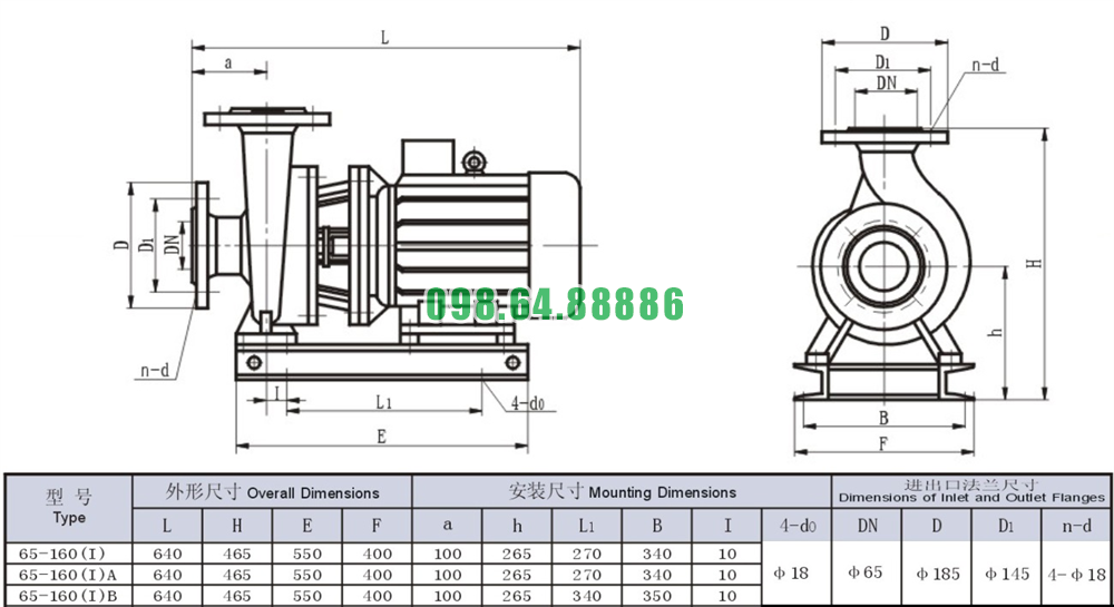 Bản vẽ cấu tạo và kích thước bơm li tâm trục ngang mã SLW65-ISW65-160-I lưu lượng 65 m3/h