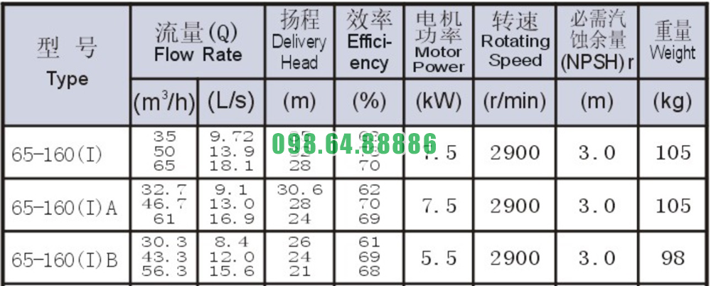 Bảng thông số kỹ thuật bơm li tâm trục ngang mã SLW65-ISW65-160-I lưu lượng 65 m3/h