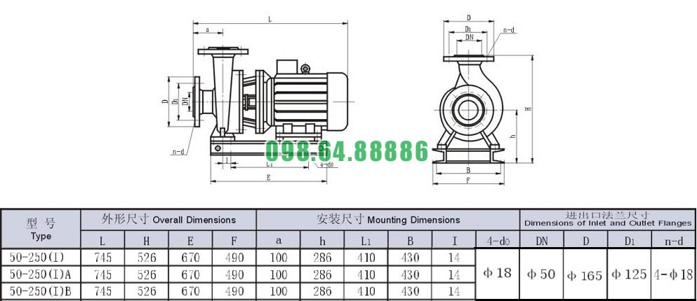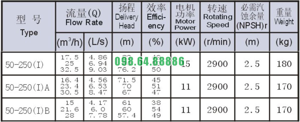 Bảng thông số kỹ thuật bơm li tâm trục ngang mode SLW-ISW50-250-I