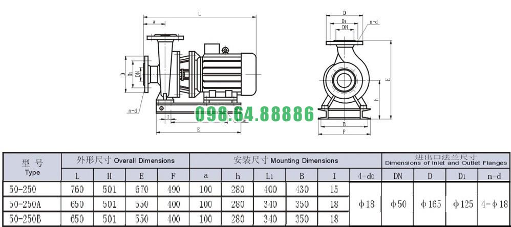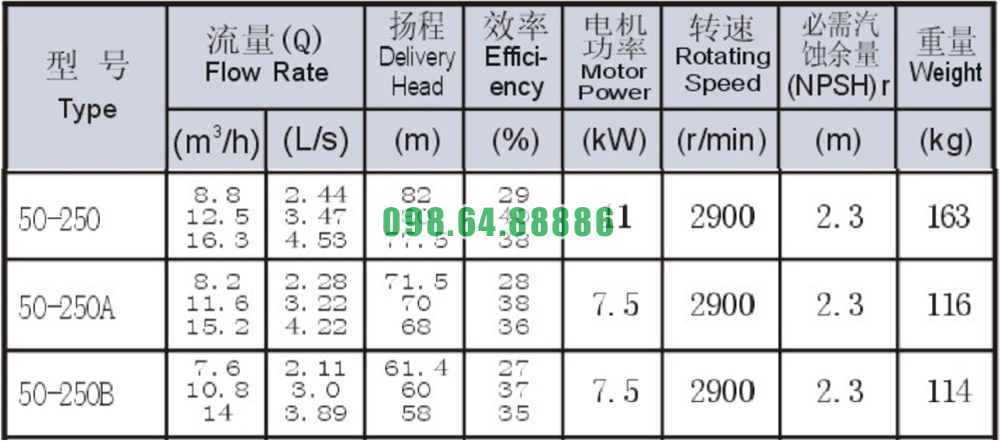 Bảng thông số kỹ thuật bơm li tâm trục ngang mode SLW-ISW50-250