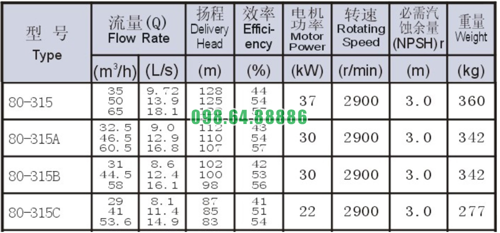 Bảng thông số kỹ thuật bơm li tâm trục ngang mode SLW80-ISW80-315