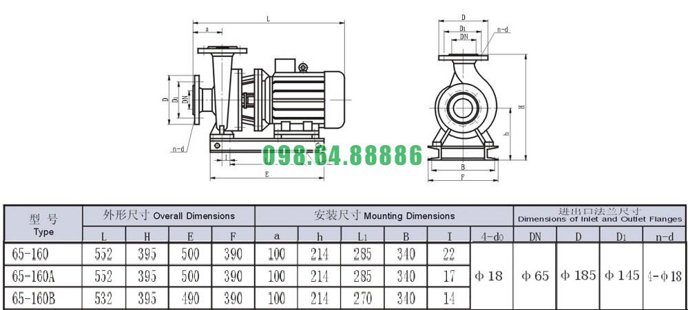 Bản vẽ cấu tạo và kích thước bơm li tâm trục ngang SLW-ISW65-160 lưu lượng 9.03 L/s hoặc 32.5 m3/h
