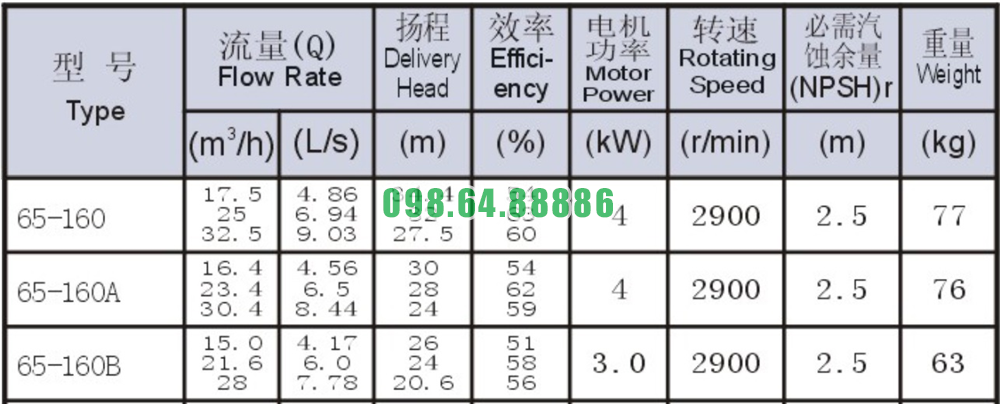 Bảng thông số kỹ thuật bơm li tâm trục ngang SLW-ISW65-160 lưu lượng 9.03 L/s hoặc 32.5 m3/h