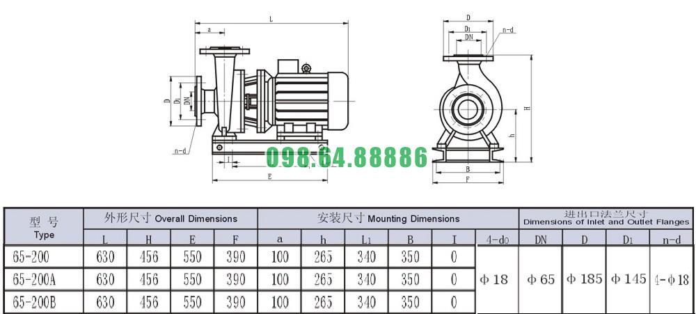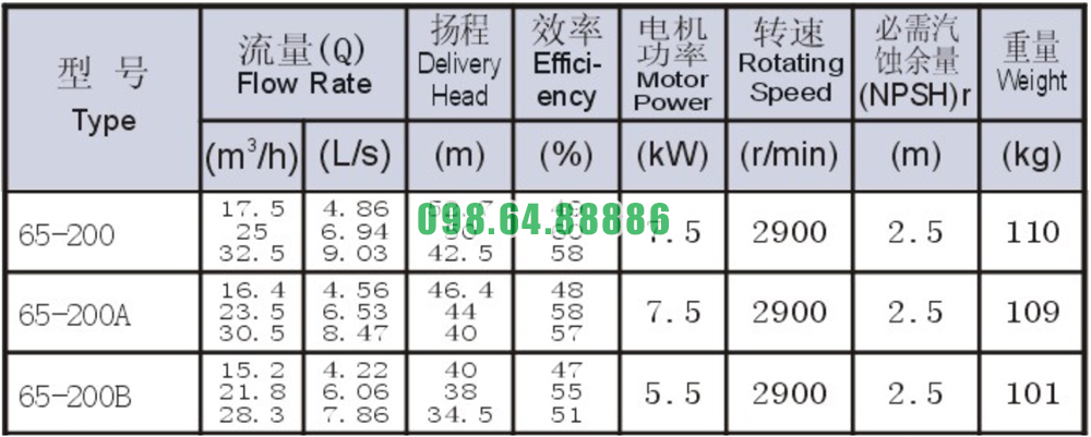 Bảng thông số kỹ thuật bơm li tâm trục ngang SLW-ISW65-200