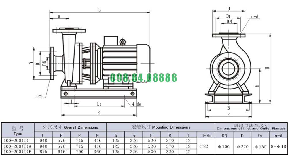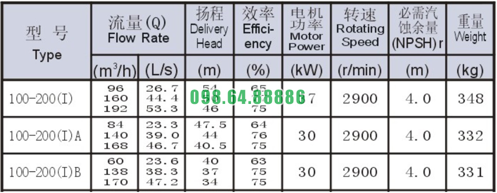 Bảng thông số kỹ thuật bơm nước li tâm trục ngang công suất 192 m3/hs model SLW100-ISW100-200-I