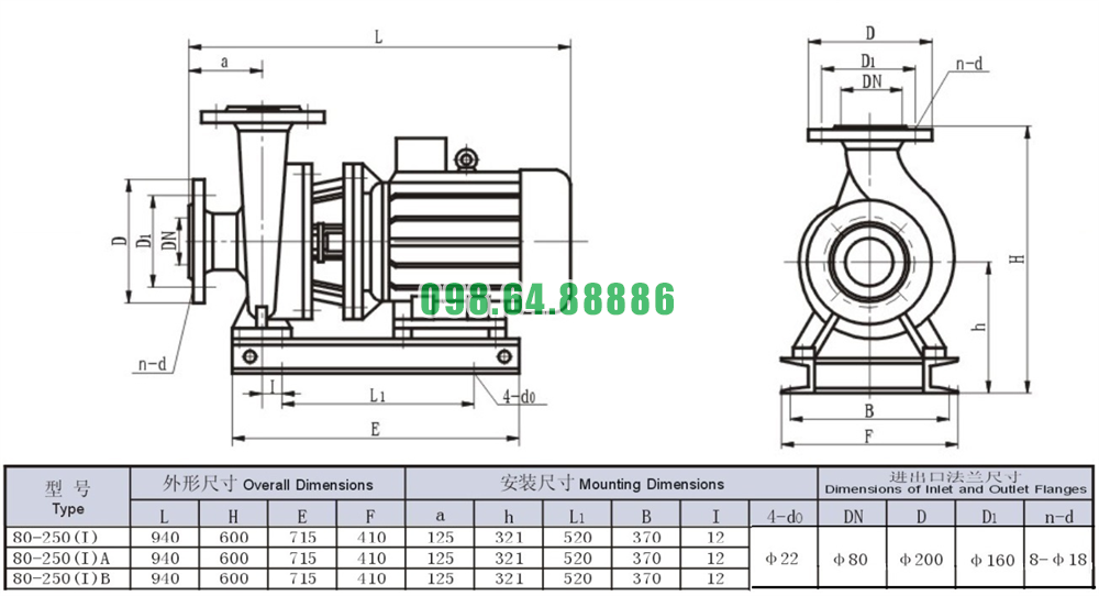 Bản vẽ cấu tạo và kích thước bơm nước li tâm trục ngang đẩy cao 54m mã SLW80-ISW80-250-I