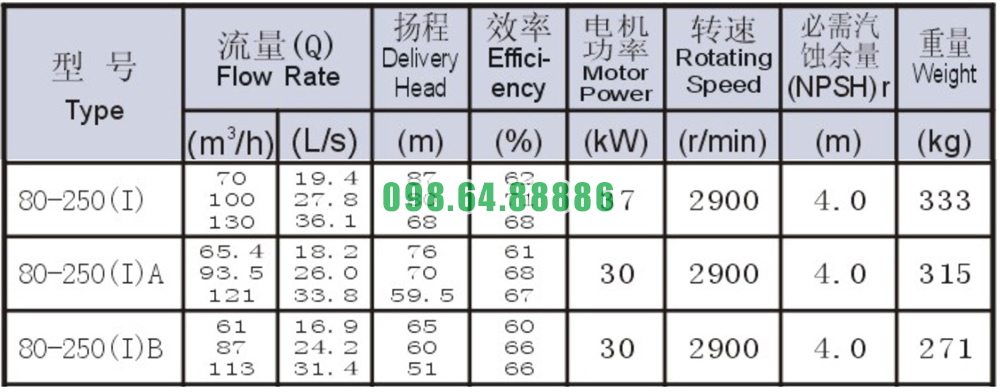 Bảng thông số kỹ thuật bơm nước li tâm trục ngang đẩy cao 54m mã SLW80-ISW80-250-I