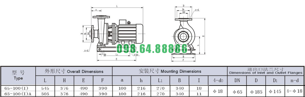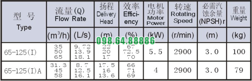 Bảng thông số kỹ thuật bơm nước li tâm trục ngang lưu lượng 18.1 L/s mã SLW65-ISW65-125-I