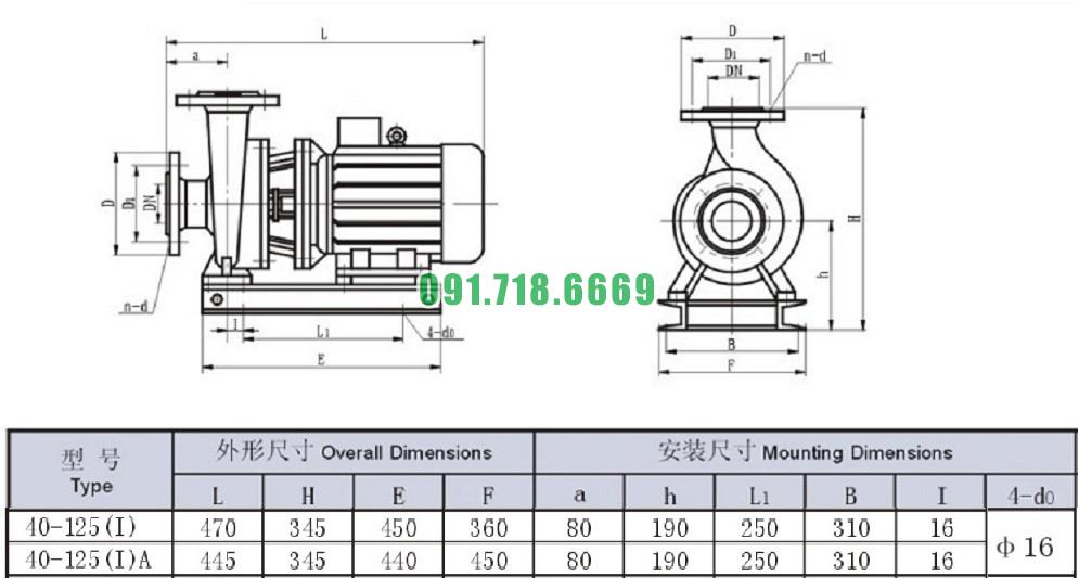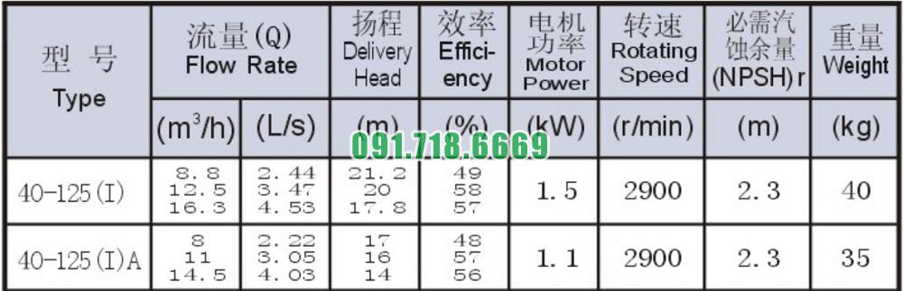 Bảng thông số kỹ thuật bơm nước li tâm trục ngang lưu lượng 4.53 L/s mã SLW-ISW40-125-I