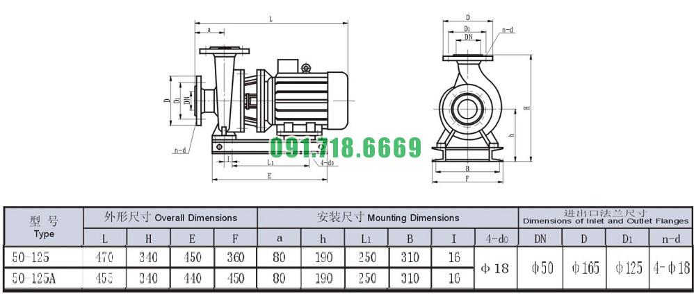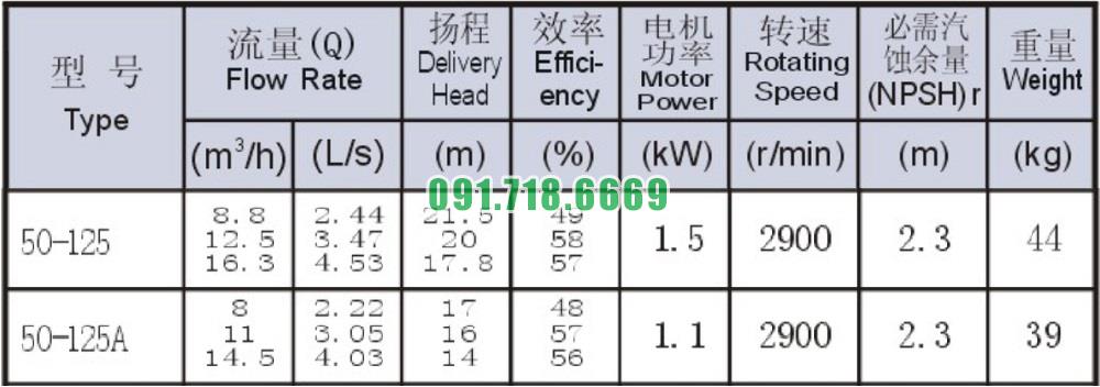 Bảng thông số kỹ thuật bơm nước li tâm trục ngang SLW-ISW50-125