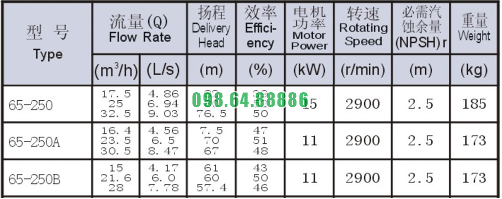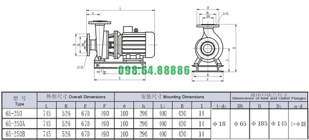 Bảng thông số kỹ thuật bơm nước li tâm trục ngang SLW65-ISW65-250