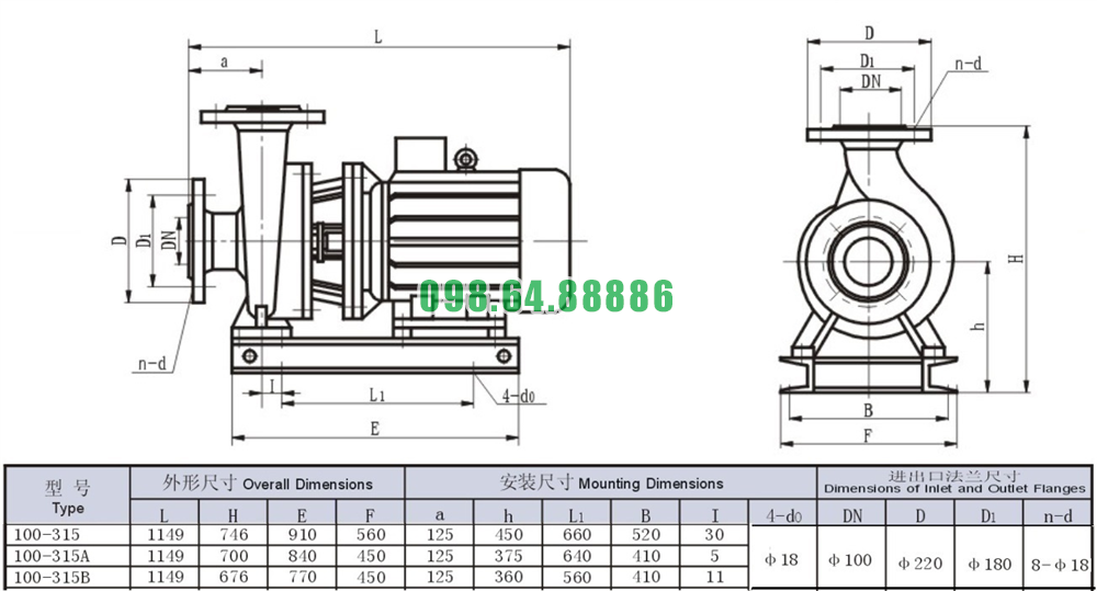 Bản vẽ cấu tạo và kích thước bơm nước nằm ngang SLW100-ISW100-315 hiệu suất 70 m3/h - 130 m3/h
