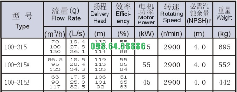 Bảng thông số kỹ thuật bơm nước nằm ngang SLW100-ISW100-315 hiệu suất 70 m3/h - 130 m3/h