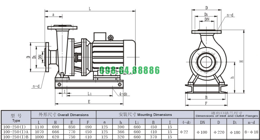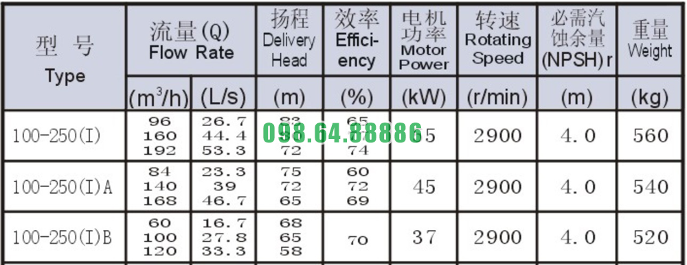 Bảng thông số kỹ thuật bơm nước nằm ngang SLW100-ISW100-250-I vòng quay 2900 r/min