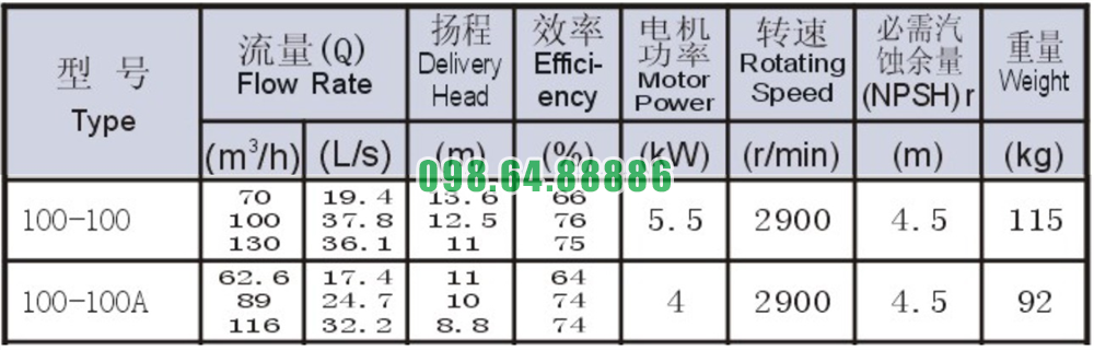 Bảng thông số kỹ thuật bơm nước trục ngang SLW100-ISW100-100