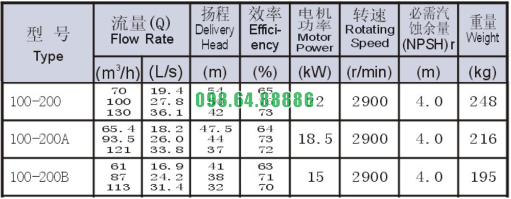 Bảng thông số kỹ thuật bơm nước trục ngang SLW100-ISW100-200 tốc độ quay 2900 r/min