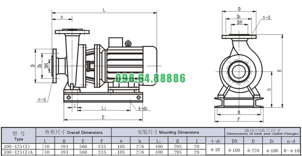Bản vẽ cấu tạo và kích thước bơm nước trục ngang SLW100-ISW100-125-I hiệu suất max 192 m3/h