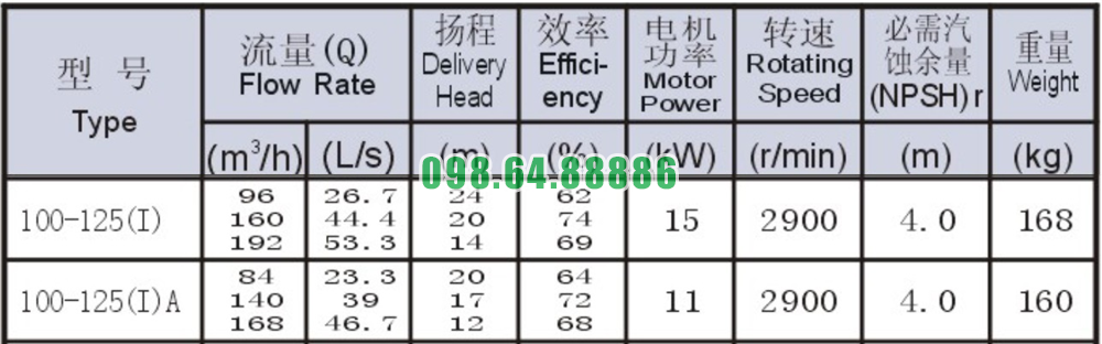 Bảng thông số kỹ thuật bơm nước trục ngang SLW100-ISW100-125-I hiệu suất max 192 m3/h