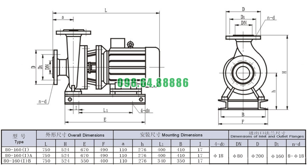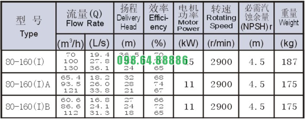 Bảng thông số kỹ thuật bơm nước trục ngang SLW80-ISW80-160-I khối lượng 187 kg