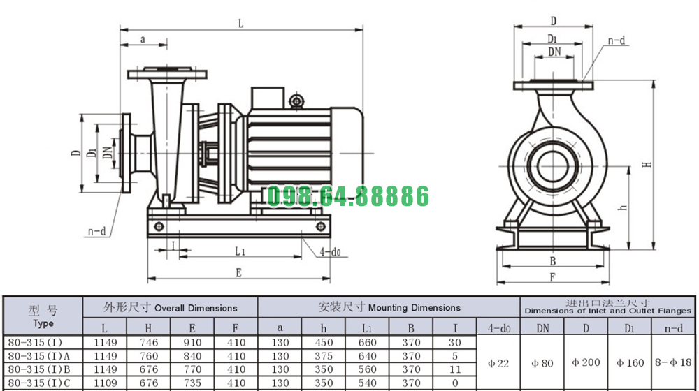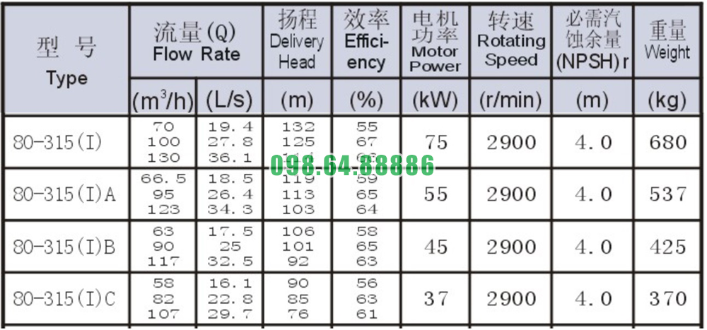 Bảng thông số kỹ thuật bơm nước trục ngang SLW80-ISW80-315-I tốc độ quay 2900 r/min