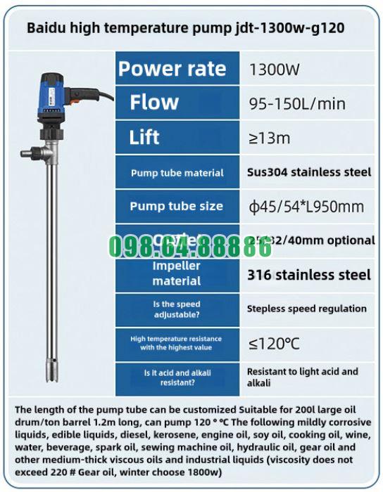 Với vật liệu inox không phát tia lửa, khả năng chịu nhiệt cao, độ ổn định cơ học tốt và hệ gioăng phớt làm kín an toàn, bơm thùng phuy nhiệt độ cao JDT-1300W-G120 sở hữu ưu điểm chống cháy nổ rõ rệt. Đây là nền tảng quan trọng giúp thiết bị vận hành an toàn, tin cậy trong các môi trường làm việc với chất lỏng nhiệt độ cao và tiềm ẩn nguy cơ cháy nổ.