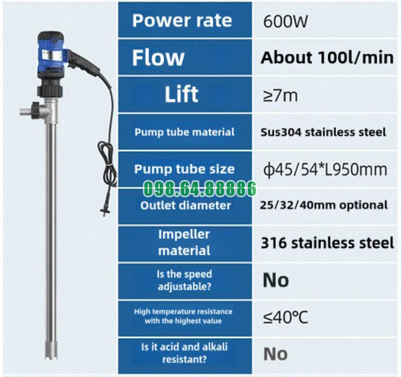 Bơm thùng phuy điện model JDT-600W-304SUS là lựa chọn hoàn hảo để bơm chất lỏng có độ ăn mòn thấp nhờ vật liệu inox 304SUS, phớt bơm chống rò rỉ và hệ thống cánh bơm chịu hóa chất nhẹ. Thiết bị vừa bền bỉ, an toàn, vừa tiết kiệm chi phí, phù hợp với các ngành sản xuất hóa chất nhẹ, dung môi, dầu nhớt, xử lý nước và pha chế.