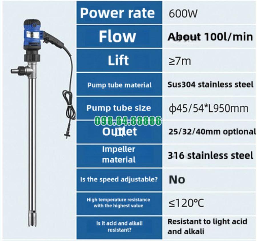 Bơm thùng phuy nhựa RPP JDT-G120-600W thường sử dụng điện áp 220V – 50Hz, là mức điện phổ thông tại Việt Nam. Khi vận hành cần đảm bảo: