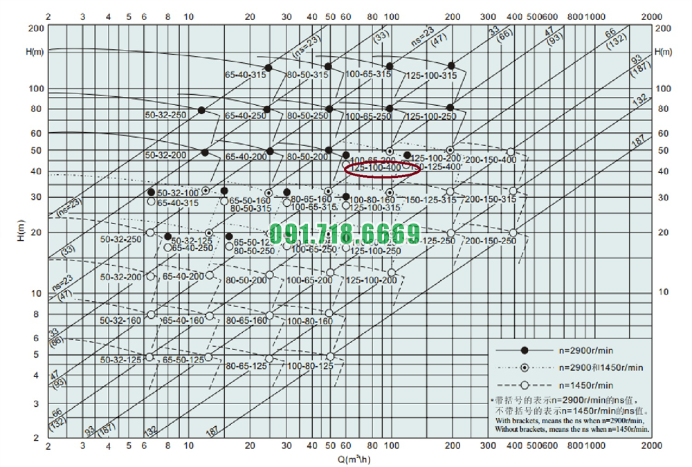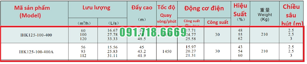 Bảng lưu lượng của máy bơm nước li tâm cánh hở IHK125-100-400 kích thước Dn125