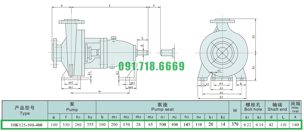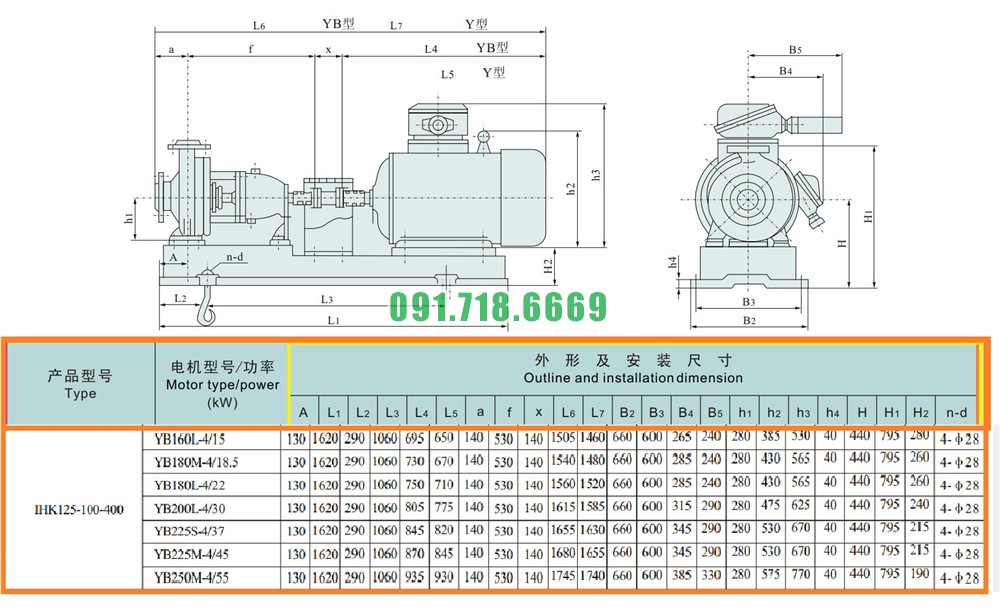 Kích thước lắp đặt của máy bơm nước li tâm cánh hở IHK125-100-400 kích thước Dn125