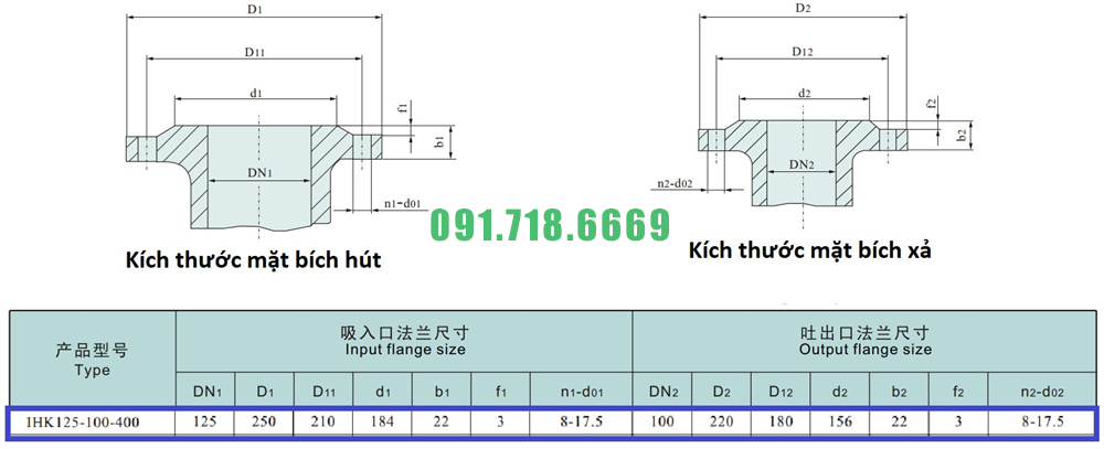Kích thước mặt bích của máy bơm nước li tâm cánh hở IHK125-100-400 kích thước Dn125