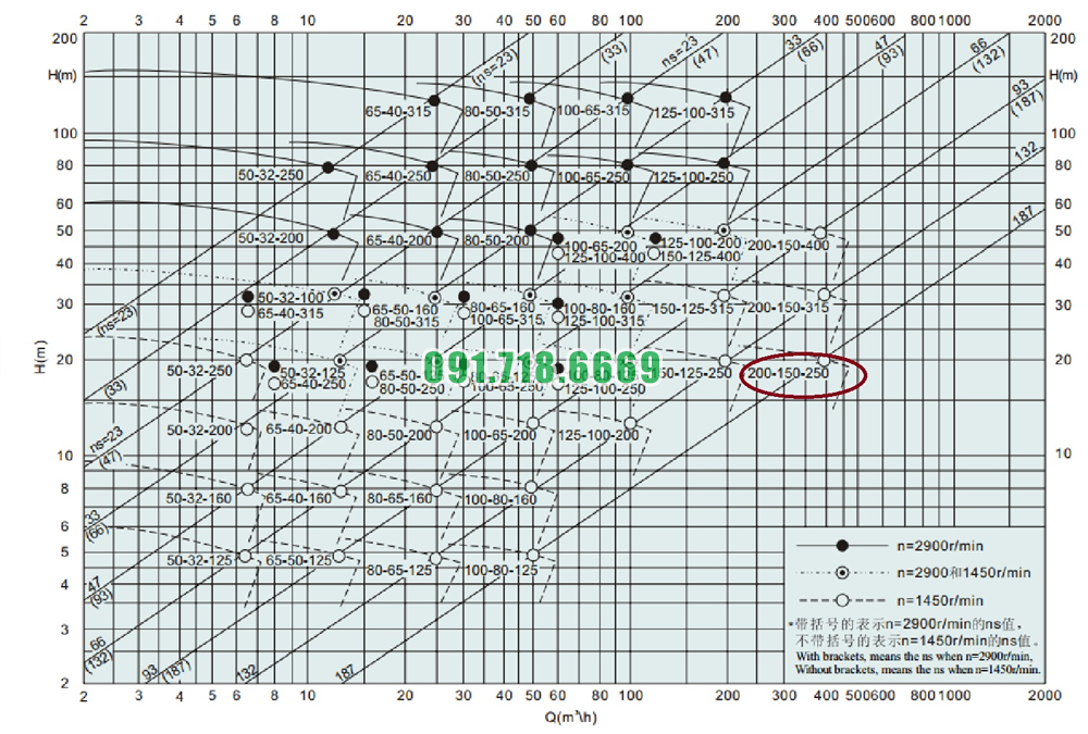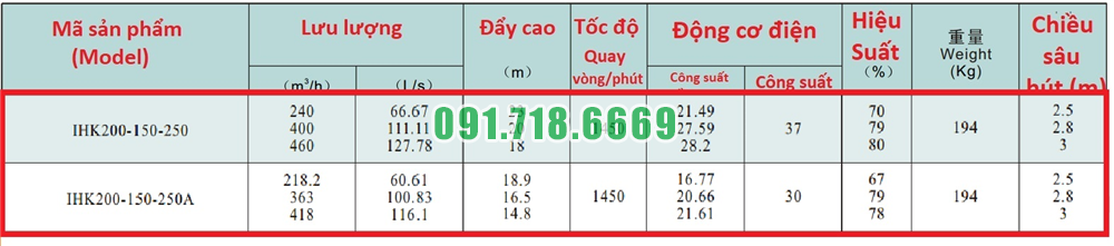 Bảng lưu lượng của máy bơm nước li tâm cánh hở IHK200-150-250 hiệu suất 460 m3/h
