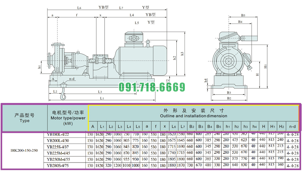 Kích thước lắp đặt của máy bơm nước li tâm cánh hở IHK200-150-250 hiệu suất 460 m3/h