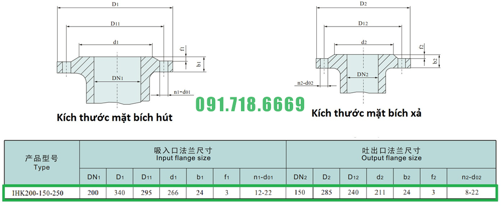 Kích thước mặt bích của máy bơm nước li tâm cánh hở IHK200-150-250 hiệu suất 460 m3/h