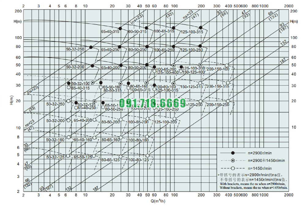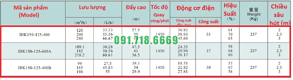 Bảng lưu lượng của máy bơm nước sạch li tâm cánh hở IHK150-125-400