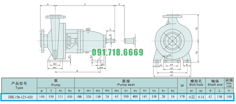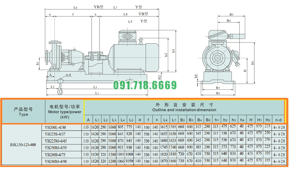 Kích thước của đầu máy bơm nước sạch li tâm cánh hở IHK150-125-400