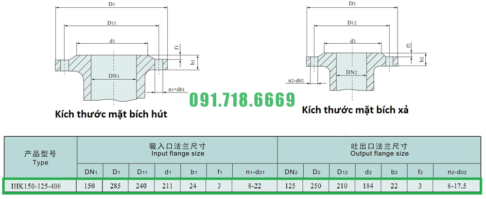 Kích thước mặt bích của máy bơm nước sạch li tâm cánh hở IHK150-125-400