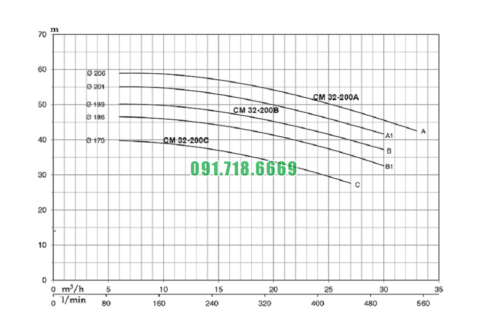 Đường cong hiệu suất máy bơm nước sạch li tâm CM32-200A động cơ điện 7.5 kw